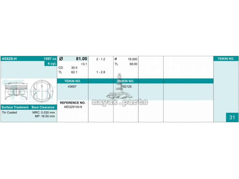 Поршня Mitsubishi Space Star (DG3), Lancer (CB#, CK#), Carisma (DA#), Colt (CA#, CJ#) 4G92S-H std 1.2-1.2-2.8