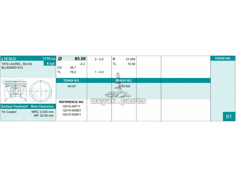 Поршня Nissan Bluebird (910), Laurel (C31) Z18, Z20, L18 1.0 2-2-4