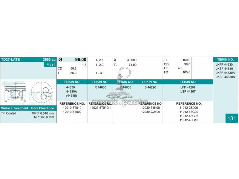 Поршня Nissan Terrano (WD21), Patrol (Y60), Urvan (E24) с чугун вставкой TD27-LATE 0.5 2.5-2-3