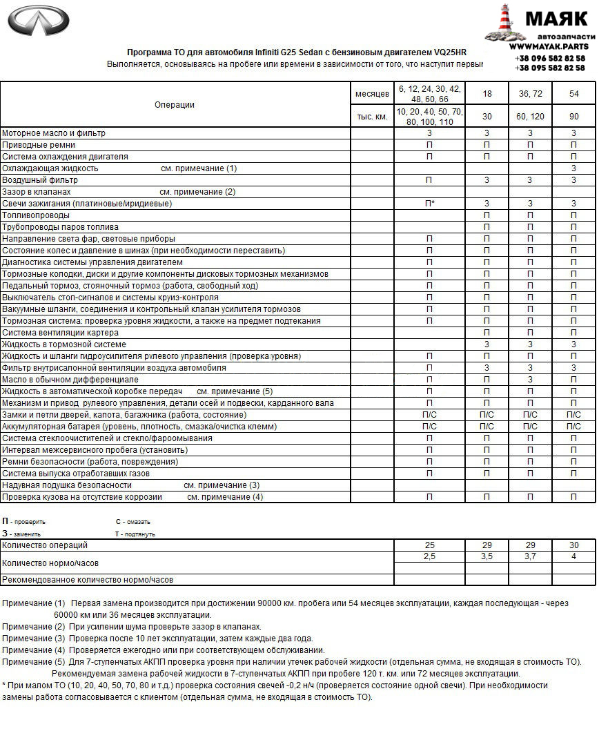Программа технического обслуживания Infiniti G25 V36 c бензиновым двигателем VQ25 (2.5)